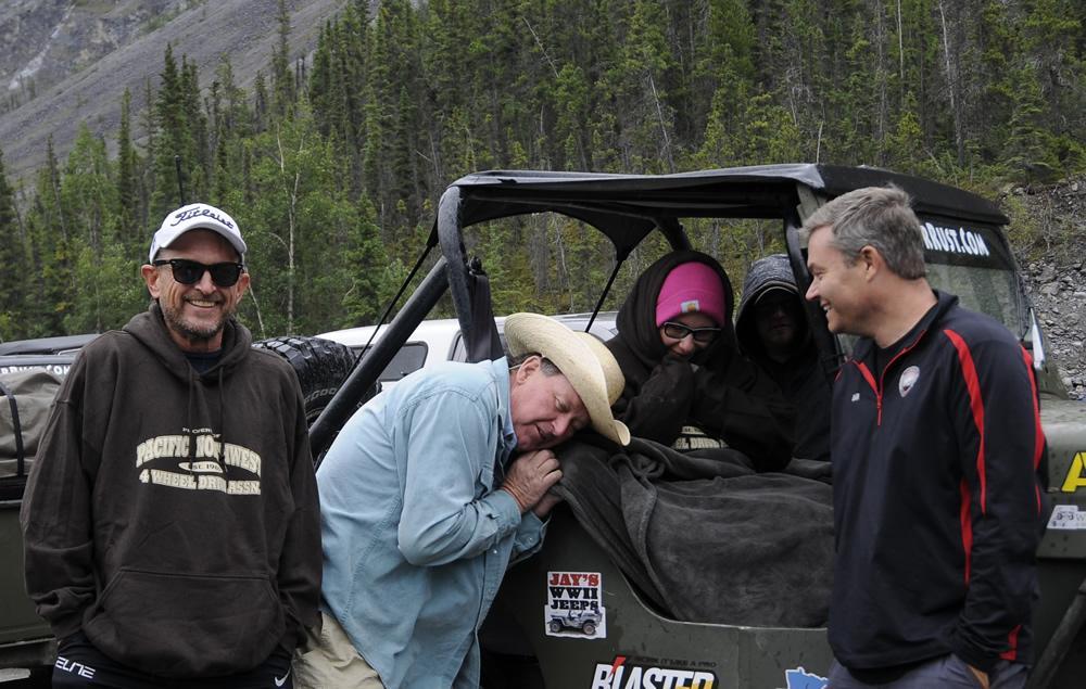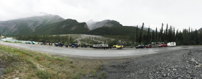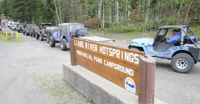 Our planned lunch stop for the day was world-famous Laird Hotsprings. Fortunately, the rain subsided by the time we arrived. While most of the crew explored the hot springs, Hugo, Fernando and I stayed with the vehicles to keep an eye on them. Some men from Alberta, possibly Amish, were looking at the jeeps with interest, so we chatted for a while.