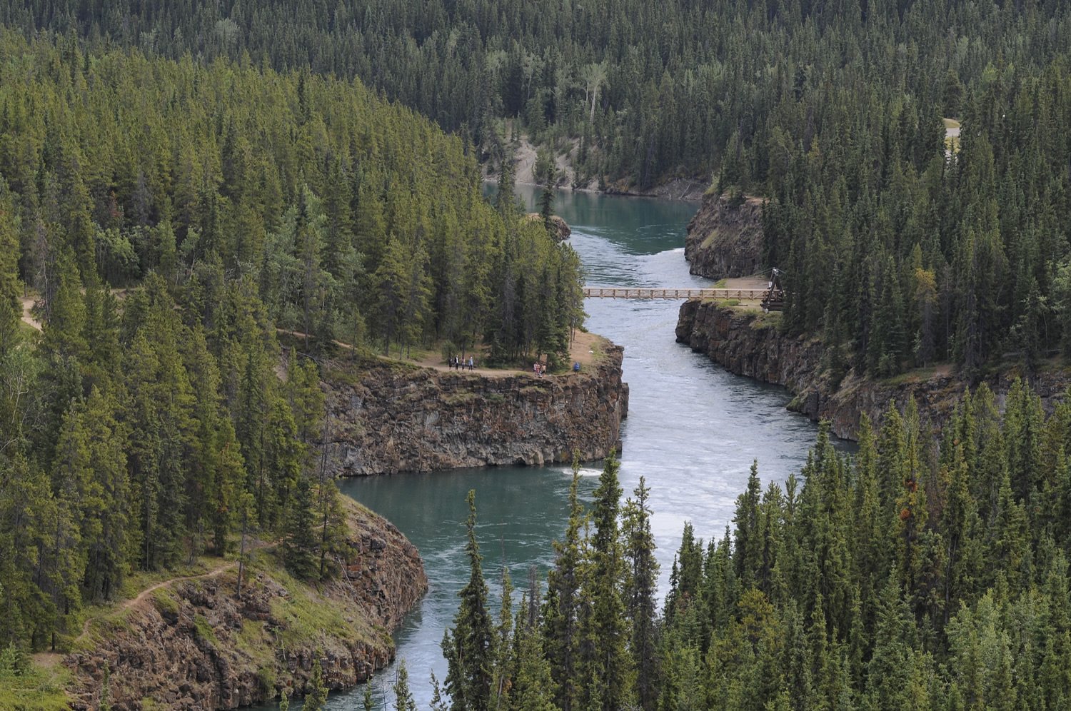 If you are driving the Alaska Highway, just before reaching Whitehorse, there’s a turnoff for Miles Canyon. Take it. There’s are a couple different places to park and see the beautiful Yukon River as it courses through Miles Canyon.