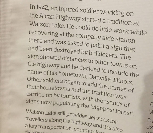 This explains how the sign forest in Watson Lake started:2017-08-08-whitehorse-museum9 2017-08-08-whitehorse-museum10