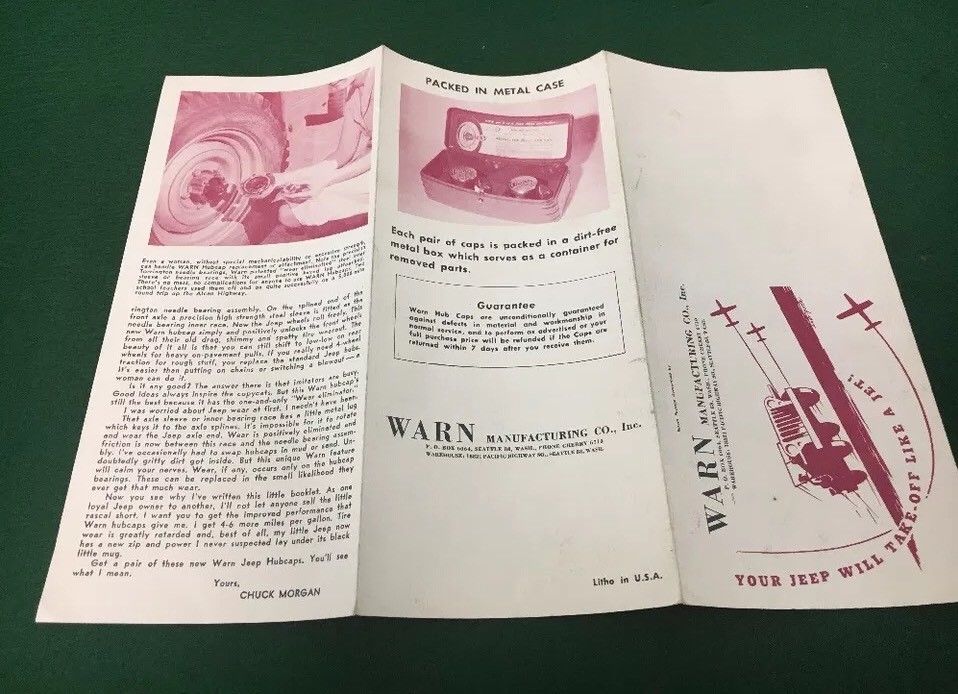 I missed out on these early Warn brochures that sold on eBay. There were two hubcap brochures, also known as “summer hubs”. The third brochure (in yellow) touts the Automatic Warn Hub. According to Hugo Vidal, Warn Industries and Hugo’s company AVM had all kinds of trouble with the Automatic hub, so it was discontinued (possibly in favor of the Warn Lockomatic hub?).