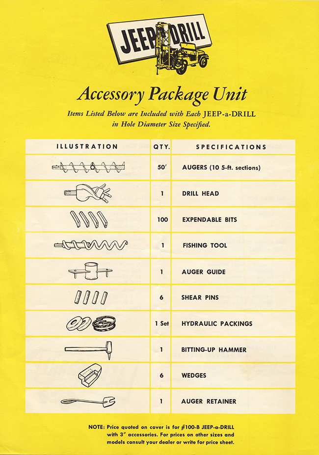 Originally posted October 2017: Mobile Drilling, Inc., produced this brochure about their Jeep-A-Drill product. there were there models (100-A, 100-b, 200), two powered by hydraulics and the cheapest one, the 100-A, powered by a hand crank.