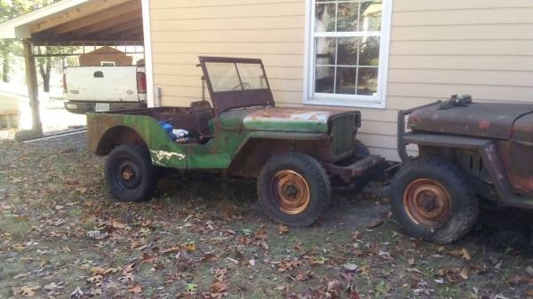 “2 Jeeps 1946 CJA been sitting in shed for yours complete floor rust have not tried to turn motor over yet and 1945 military keep M B O R D same cons rusty not sure if motor is free but complete both have original flatheads etc”