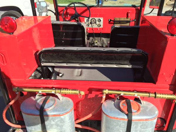 (04/26/2016) “1952 Willys Jeep/ M38A1 (former Military/early CJ) converted to Brush Fire pumper somewhere along the way. I don’t have much history on this vehicle. But, Drives great, pump disconnected for now, but does work. New Paint 2 years ago. (NOTE; PHOTOS SHOW FORMER UPPER HOSE TRAY, HOSE REEL AND TANK WHICH HAVE BEEN REMOVED AND SCRAPPED, REPLACED WITH SECOND SEAT IN REAR WITH MATCHING FRONT SEAT UPHOLSTERY) Now a GREAT truck for parades with the family or cruising the hills of California, or wherever. Fits in any garage!