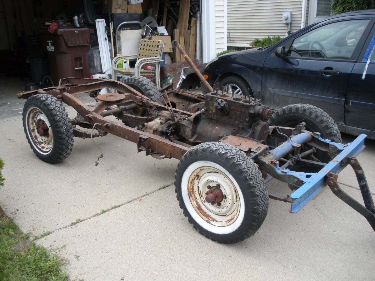 “1945 Willys rolling frame includes engine, bell housing, trans and t-case, axles with springs, and steering gear box.