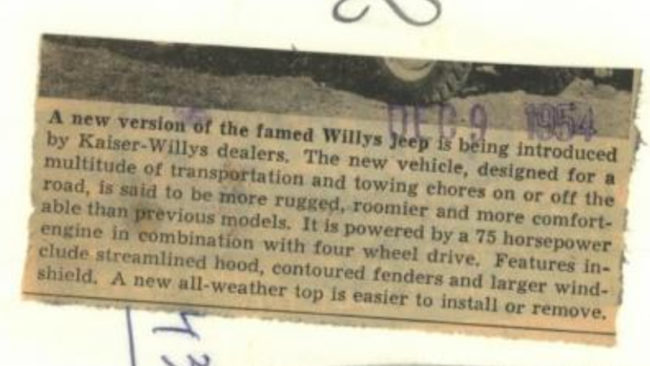 “1954 Press Photo A new version of the famed Willy’s Jeep is introduced. This is an original press photo. A new version of the famed Willy’s Jeep is being introduced by Kaiser-Willys dealers. The new vehicle, designed for a multitude of transportation and towing chores on or off road, is said to be more rugged, roomier and more comfortable than previous models. It is powered by a 75 horsepower engine in combination with four wheel drive. Features include streamlined hood, contoured fenders and larger windshield. A new all-weather top is easier to install or remove. Photo measures 10 x 8.25 inches. Photo is dated 12-09-1954.”