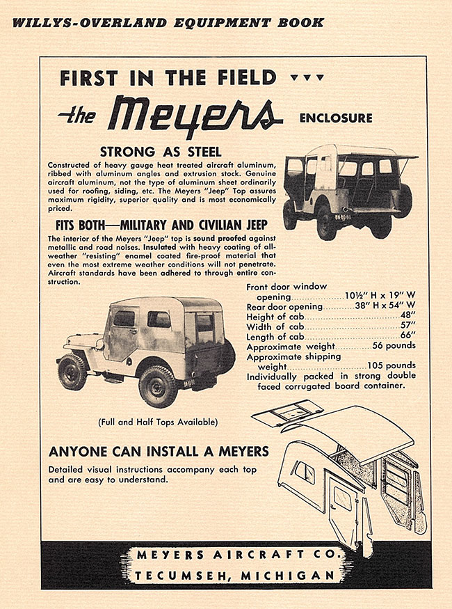 I’m looking for a Meyer’s hardtop for my 1949 CJ-3A Willys Jeep. Can anyone help. I live in Washington State. Thanks – Bob
