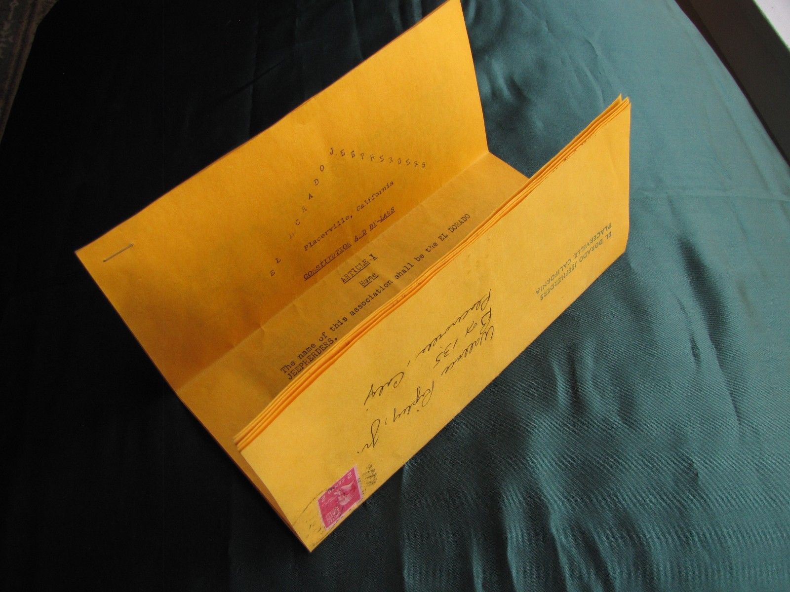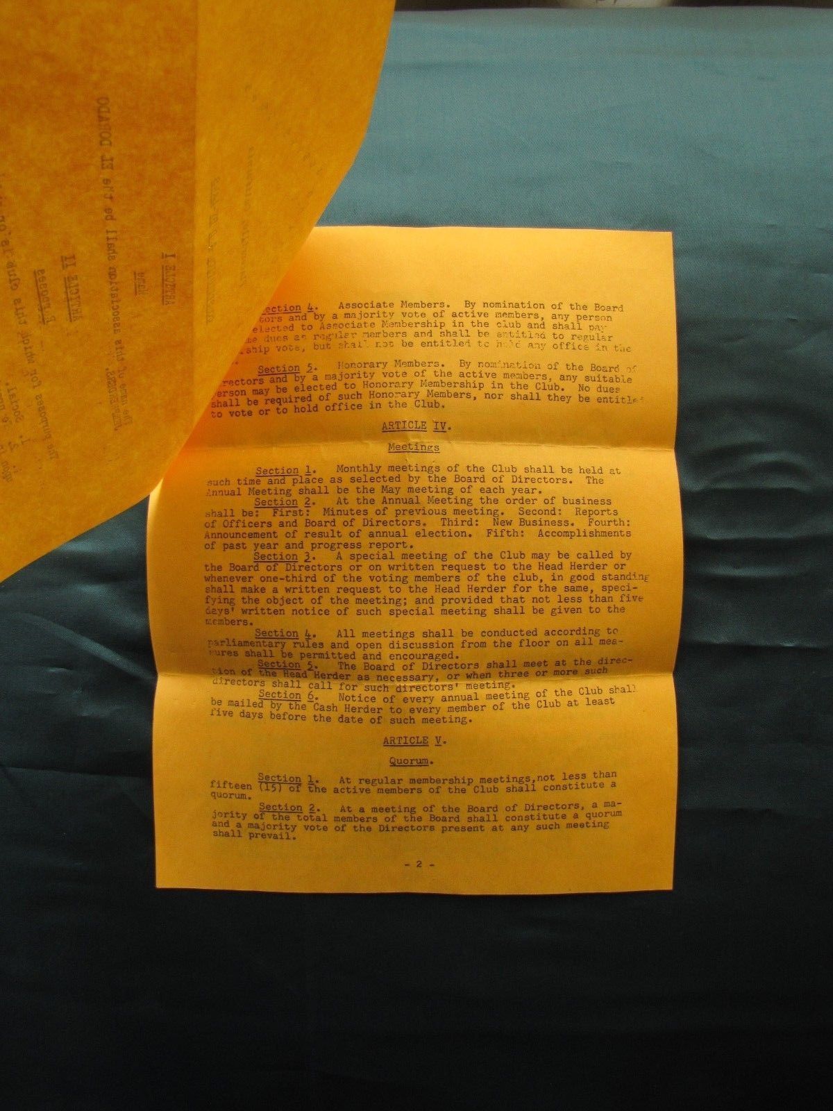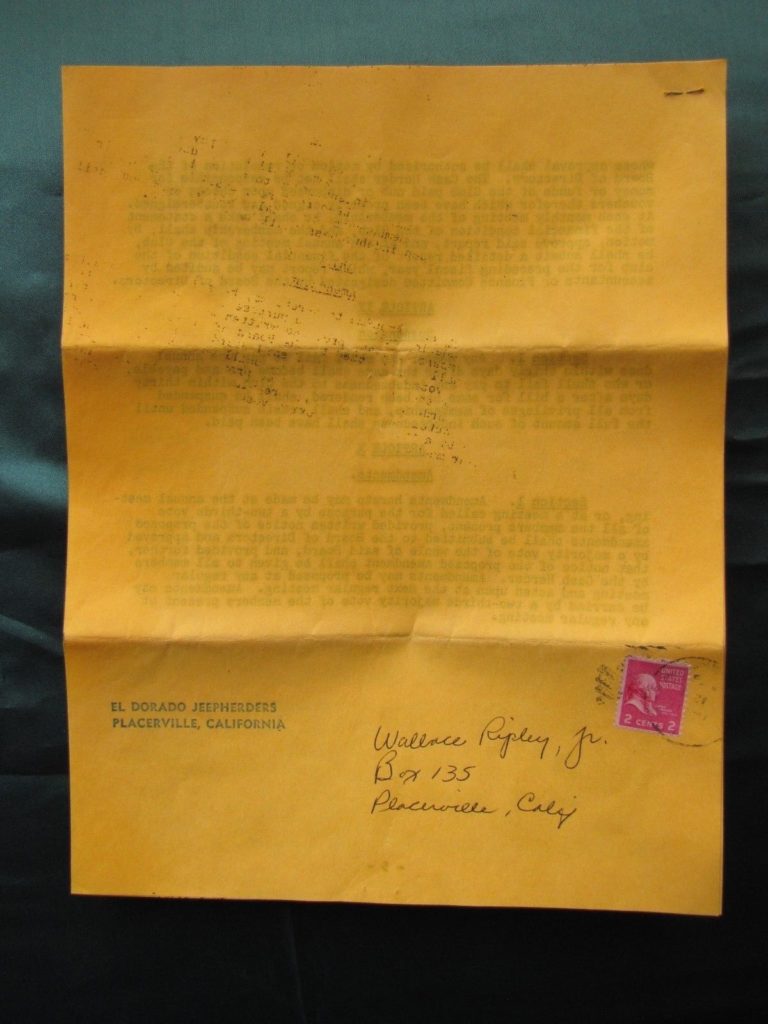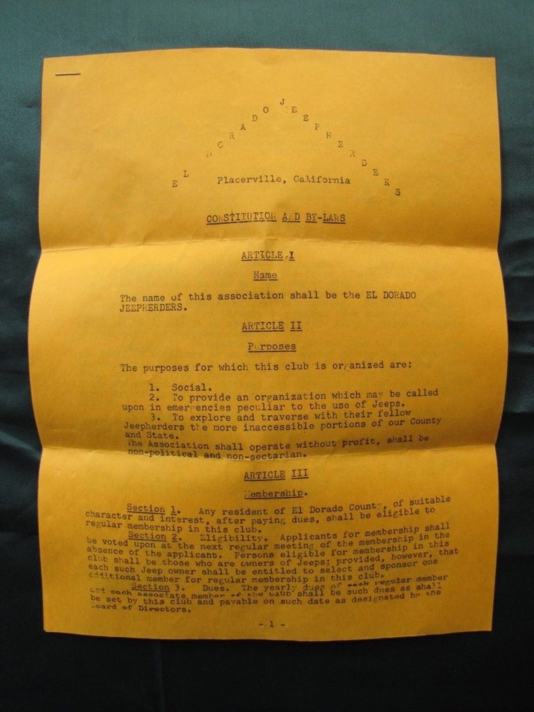 The internet claims that the El Dorado Jeepherders is the oldest jeep club in existence, however I could find no dates to confirm this. One claim puts the club’s roots in early 1950. By the early 1950s, there were several clubs in existence in the West, including the two earliest that I know of: the Yakima Ridge Runners and the Hemet Jeep Club. A copy of the club’s original bylaws can be found on eBay. Here are pics of them: