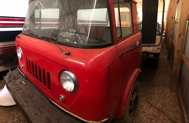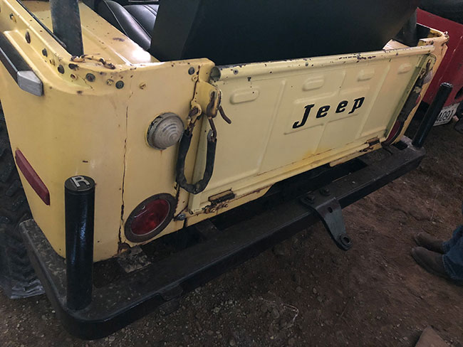 This 4-door truck has sits on a modern chassis and I”m told is great to drive. You can see a CJ-2A with a half-top (white) and tow-setup peering out from behind the truck.