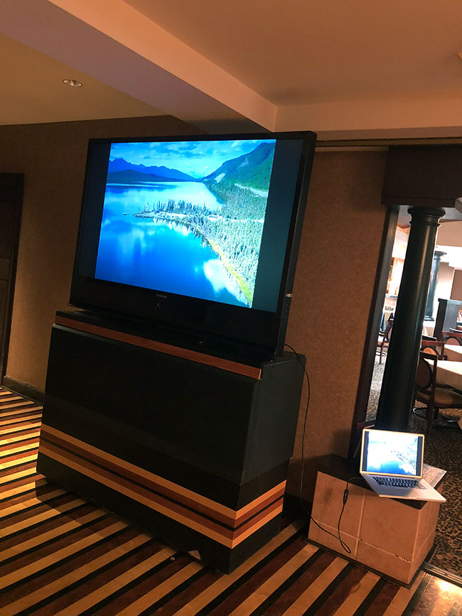Later on in the afternoon, I broke free of the booth to check on the presentation equipment. We were supposed to have a large screen TV, but what I found instead was a 32″ Samsung TV sitting on a counter in the presentation room, a room we thought might have 50 or more people. Obviously, that small tv wasn’t going to work. I found Bob Christy he had a talk with hotel staff. Then, magically, they found a huge projection TV and put that in the room. Problem solved.