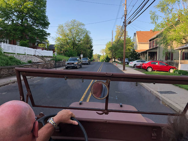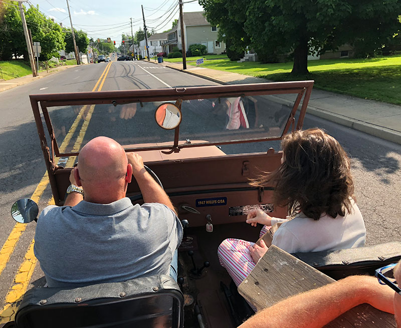 Heading out to dinner with Chuck and Laurie in their CJ-2A. It was perfect weather for a drive. in my hand is a step ladder so we could get Ann in and out of the jeep.