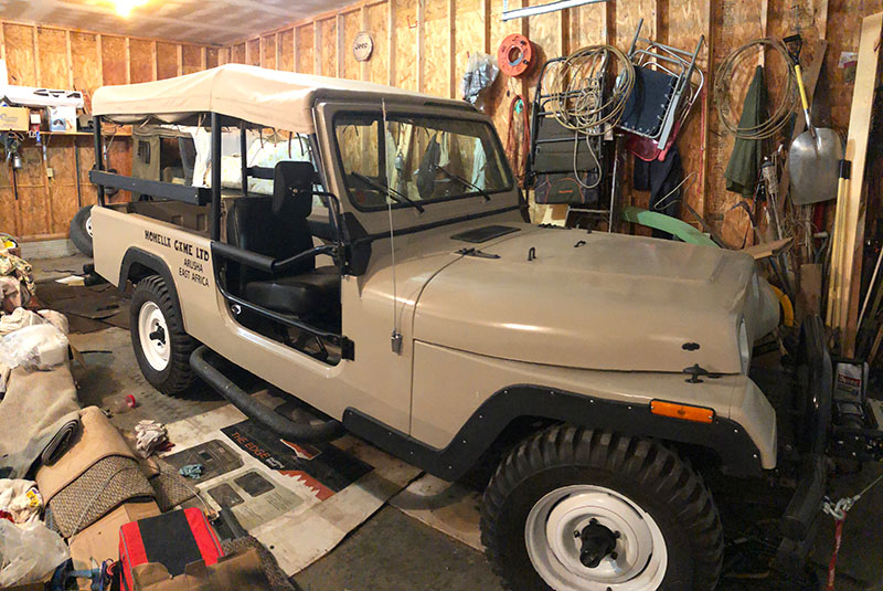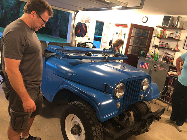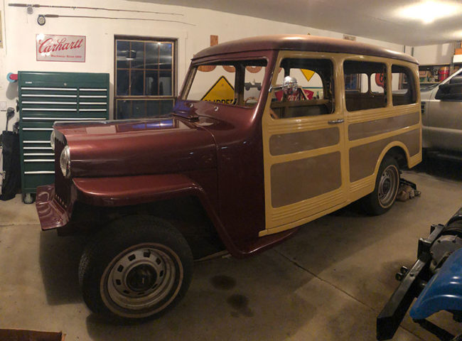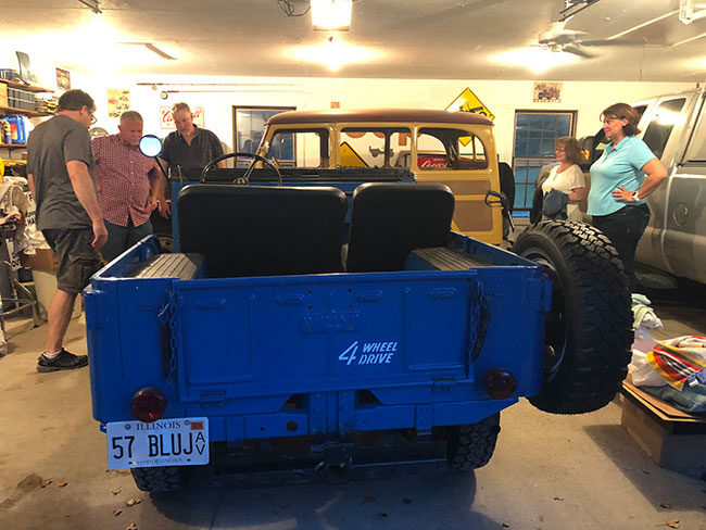 We eventually got to Russ’ jeeps. Besides the Blue/white wagon and yellow Jeepster, Russ has a couple projects, including a CJ-6, a truck, and a wagon. Here I am pointing out the problem with the saginaw steering box I ran into on Lost Biscuit: Those mid 1970s boxes will loosen, leading to cracking along the front cross member welds. Ann thought it was funny that I was suggesting to a machinist like Russ how to fix it.