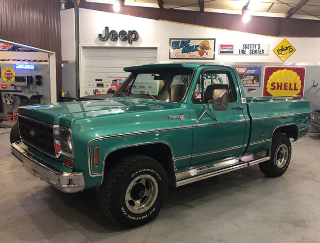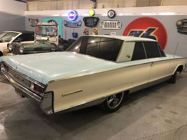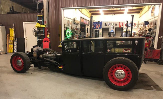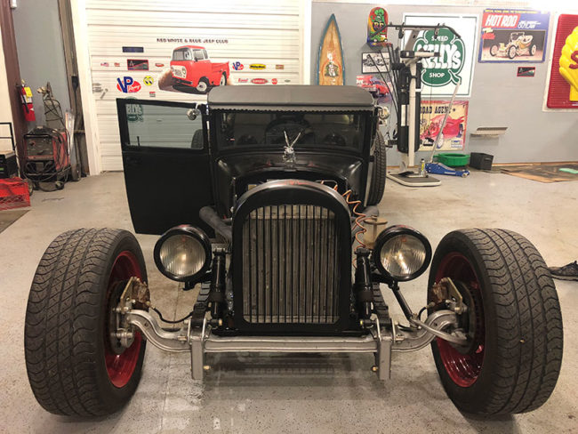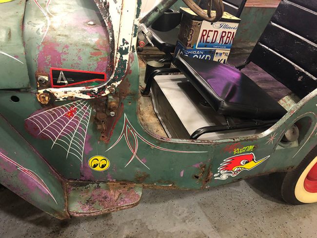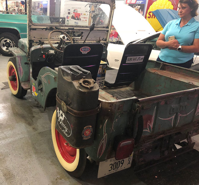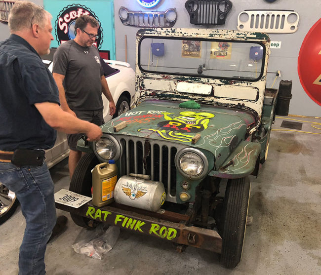 After dinner, we stopped by another member of the club, Scotty, who has a beautiful shop with some neat vehicles, including Russ’ very first jeep, a CJ-3A to which Scotty added some Rat Fink art (apparently, once a jeep enters Paris, it never leaves; It just gets bought and sold amongst members).