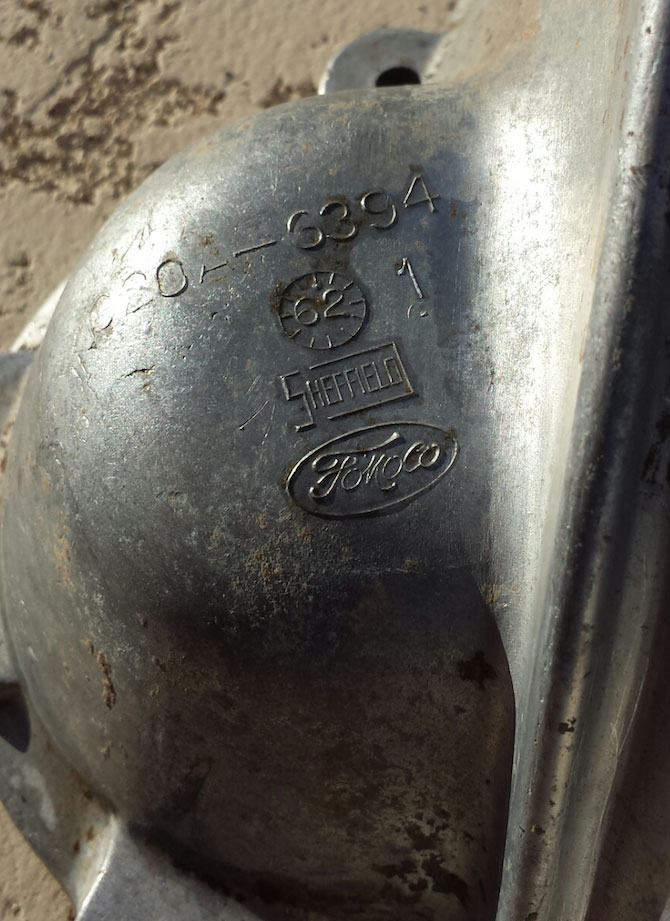 “This bell housing is from a 1962 Ford Falcon 260 (V8) motor with 4 speed trans! I also have the clutch/bearing arm for the bell housing. That’s the same engine used just 2 years later in the Mustang and even early Cobras J. The bell housing is marked C2OA-6394 FoMoCo 62-1 (Jan ’62?) and Sheffield.”