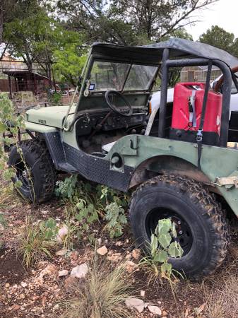 “1947 Willys Jeep, this is a hunting Jeep runs good has a 289 small block Chevy v8 a 3 speed trans, 5.38 gears front and back rear is open, front has locker. 34inch super swampers. Brakes are ok Asking 5,000$ obo Bring your trailer !”