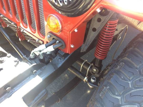 – It has front and rear leaf springs but the front are augmented with coil overs. The spring hangers and shackles are custom. The spring bushings are all new. Also a heavy duty 5th link, and upgraded steering components (steering rods, knuckles, cups and cones, seals and steering stabilizer, etc).