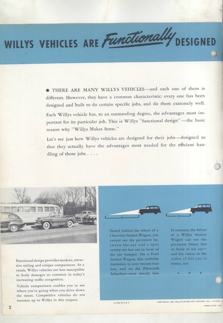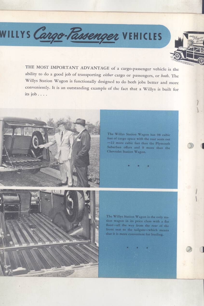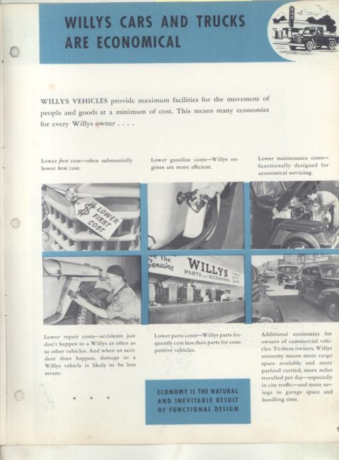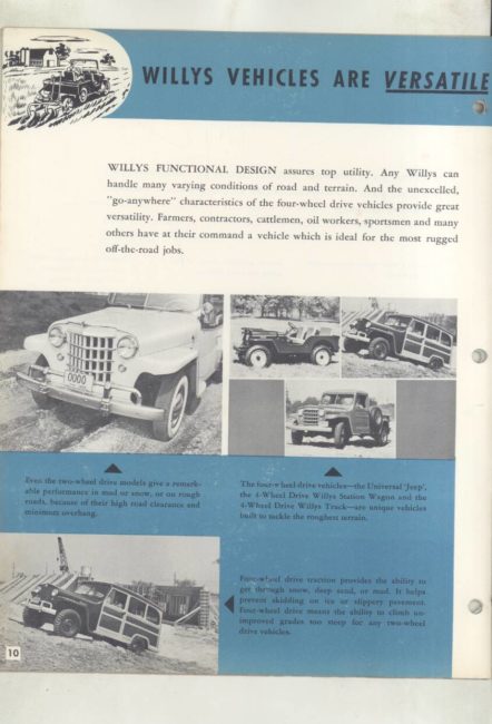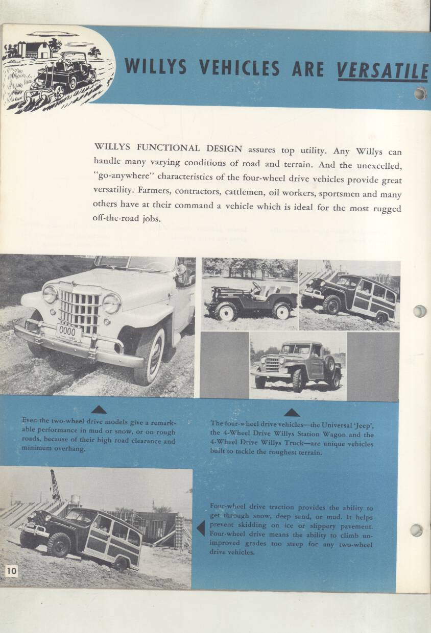 “Original salesman’s part color catalog , 8.5 x 11 , 12 pages, 3 file holes at edge , also includes non color sales sheet , 8.5 x 11 , 2 pages , shows various Willys features , descriptions , etc .”