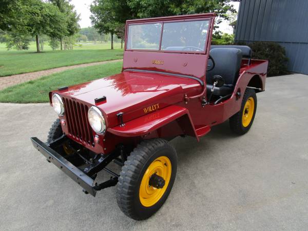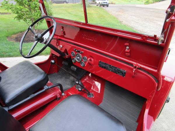“This jeep has had a complete frame off restoration restoring it to its original like-new condition starting with reproduction tub, fenders, tailgate, windshield, hood and grill all purchased from Willys Overland in Toledo, OH. All drive train components, springs, transmission, engine, electrical, etc were either professionally rebuilt or replaced with new old stock or repro parts-all receipts come with purchase. Body and paint work were done by an auto body professional in a authentic Luzon Red with harvest yellow rims and accent paint.