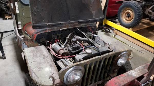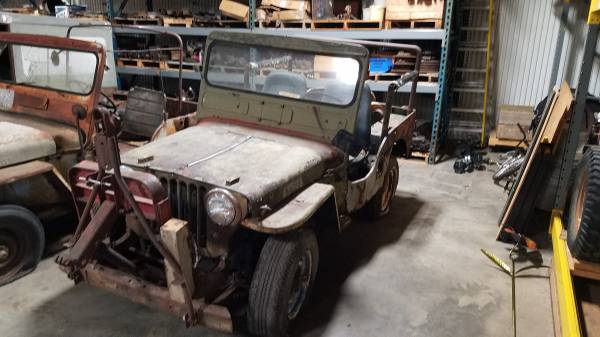 “1948 willys cj2a jeep for parts or restore. Jeep is mostly complete and currently doesn’t run. Has a pretty nice m38 windshield frame. Jeep rolls easily.
