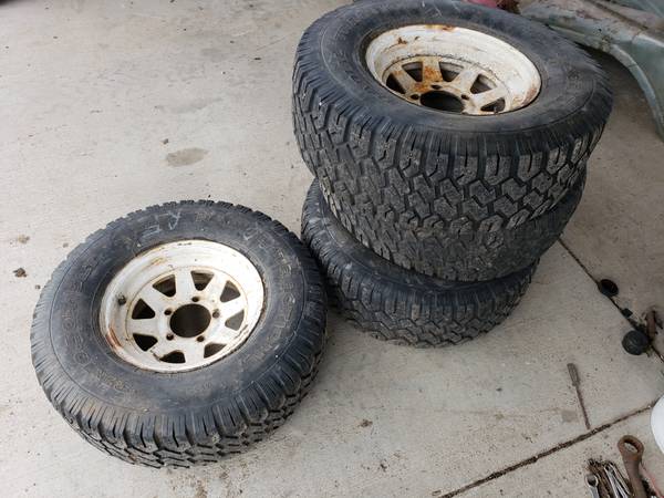 “Remove from Jeep CJ5 wheels are usable tires are old one goes flat after few days others hold are fine 40 bucks for all of them