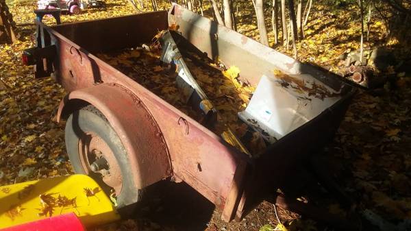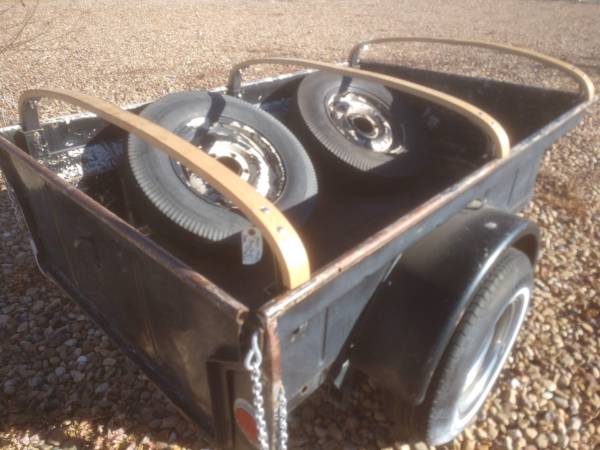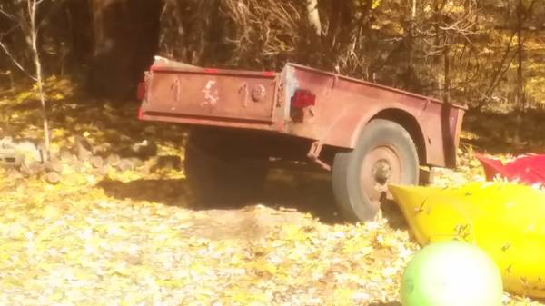 No tail lites or wiring. I think original 16″ wheels and 6.50 x 16 bias ply tires(tires are in poor condition). Trailer is in registry.