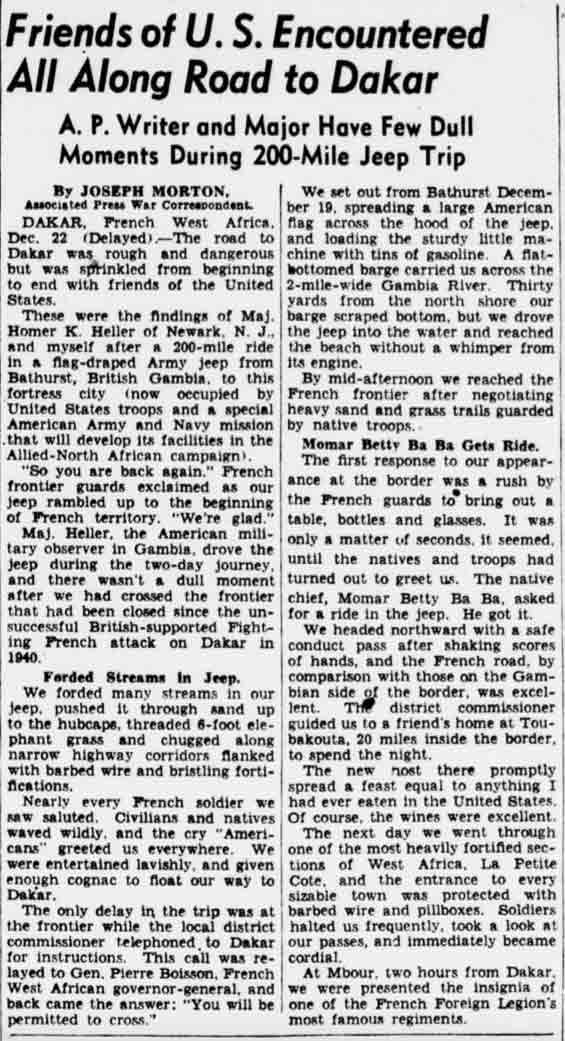 Joseph Morton’s description of his jeep trip from Bathhurst, Gambia, to Dakar, French West Africa, was published in the Evening Star, December 26, 1942. Fun fact: I got to know a Gambian ambassador to the US and was invited to Gambia to help work on a school’s computer system back in 2002, but other priorities kept me from going.