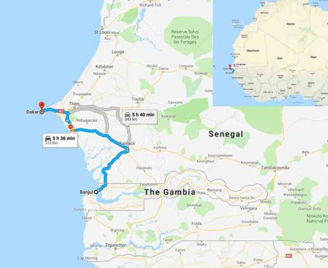 Bathhurst is now known as Banjul, Gambia’s capital city. French West Africa is now Senegal. This map *might* be close to the route taken: