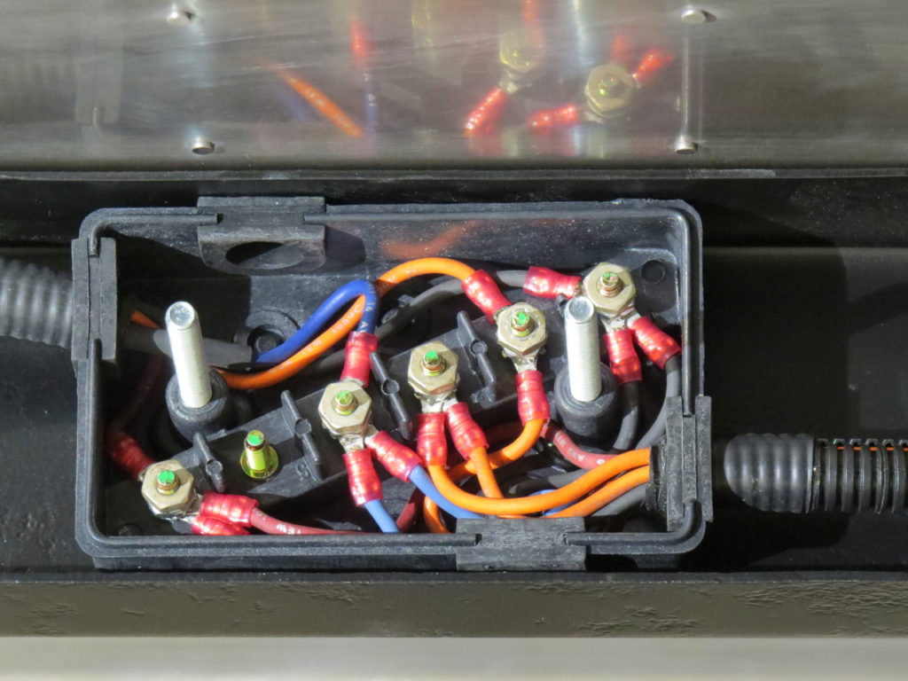 A close up view of the electrical junction box.  A cover is attached by two nuts threading onto the large machine screws so for normal operations this unit is waterproof.