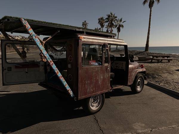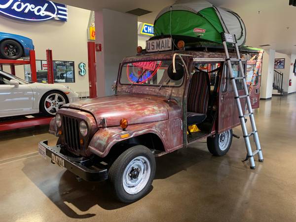 “Cool Classic Jeep. Automatic Transmission with 6 cylinder motor. Sliding doors. Super cool camper style Jeep with roof platform for sleeping or kicking back above the crowd. Vintage distressed exterior. Cool Bohemian Interior. Automatic, fully equipped for camping out. Seatbelts. Has tent, ladder and pullout eating tray. SO MUCH More. A true original Mail jeep with US Mail accents all over. New tires. Runs and drives great. Current tags, Smog exempt. Super fun ride. Top slides back and forth and has wheels and includes supports. Great for the beach, tailgate parties, Coachella, Concerts and so much more!”