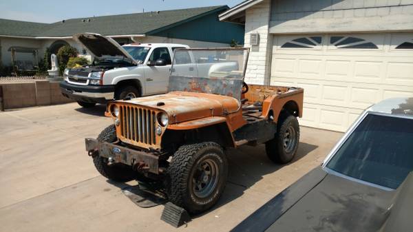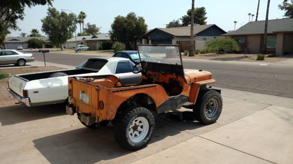Has a Chevy II 2.5. 4 cylinder with a T90 upgrade over the stock T84 with the stock twin stick Dana 18TC. Has new motor mounts,new aftermarket heavy duty alternator bracket,new water pump, new thermostat. I also have two new aluminum fuel filters, new Chrome air cleaner, new hard brake lines, new soft brake lines, new wheel cylinders. 33×10.50×15 BFG MT’s on black 15×8 wheels mounted and balanced and have never even been on the Jeep or ran. I also have a pair of suspension seats for the front. Is a project and needs some TLC. Gas tank need to be put back in with fuel lines and the exhaust downpipe needs to be refitted to the exhaust manifold. The carburetor could use to be rebuilt also.