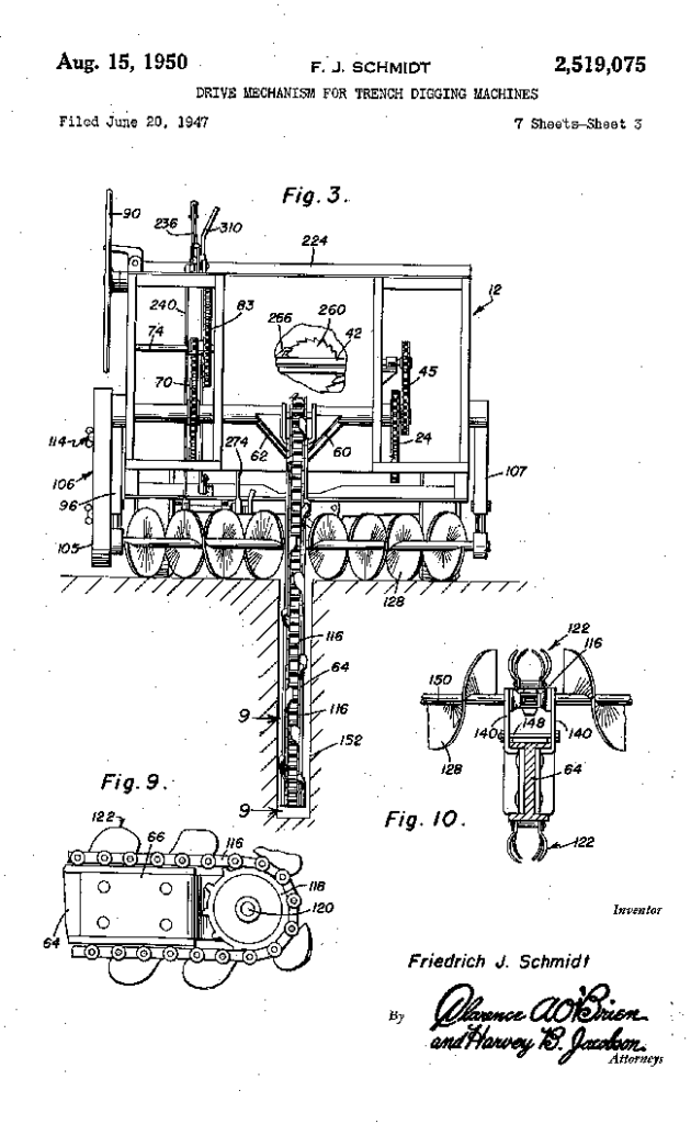 According to the filing, “An object of this invention is to provide means for digging trenches particularly suitable for mounting on a conventional vehicle such as a truck or jeep without any substantial modification thereof and driven from the vehicle power take-01f. It is a related object to provide novel means coordinated with the digger portion of the device for enabling the vehicle to be advanced positively at a speed which is only a fraction of the normally obtainable minimum speed and with the engine operating at full rated R. P. M. I”