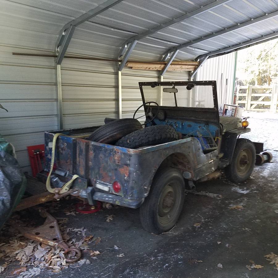 “This is a 1943 (based on VIN) GPW Military Jeep. Needs some work on the drivers and passenger floors, the axe and shovel panel and the rear panel. The rear floor and panels are solid with just surface rust. It has a CJ grill. But I have a WW2 grill which I will include. The left and right fenders need some welding. The gas tank sump needs to be replaced and it needs a gas tank. It has an L134 4 cyl Go Devil Engine, which turns easily and it has a 6 volt alternator. It should be easy to get running. Also, I believe the transmission is the T-90. Based on the color, I would say this was used by the Air Force after the war.”