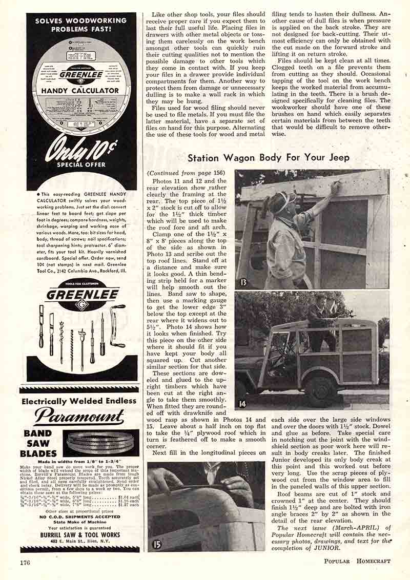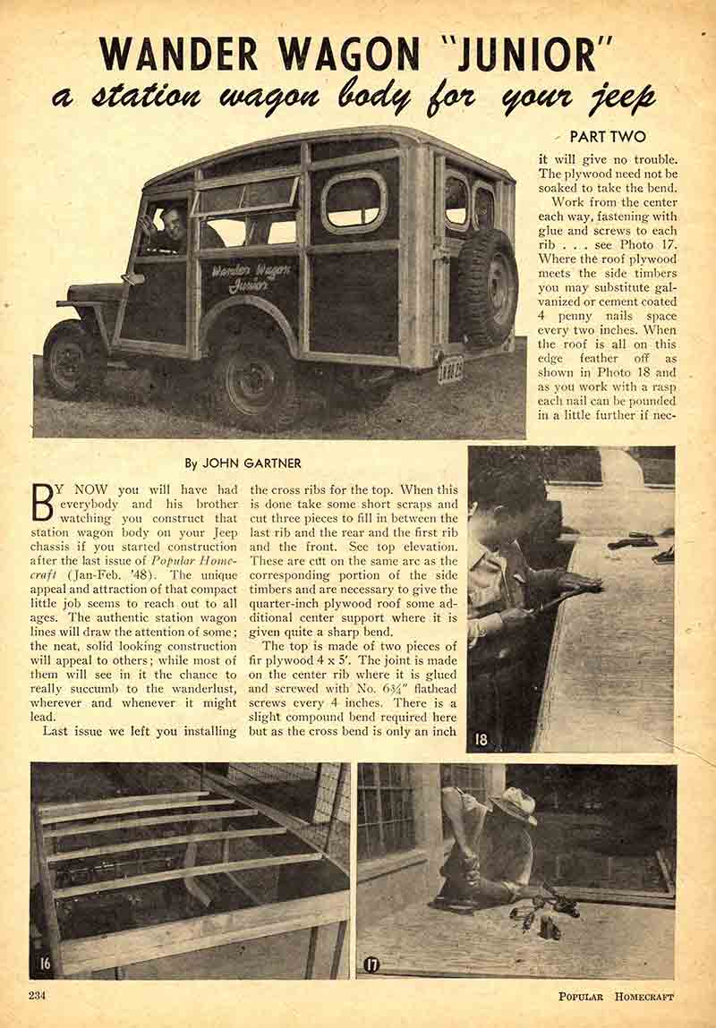 In 1948 Popular Homecraft Magazine did a two article series on the construction of a home built Jeep Station Wagon. The name for the custom wagon was the Wander Wagon Junior. The project was shared with readers over two issues, the 1948 Jan-Feb issue and the 1948 Mar-Apr issue. I was finally able to locate a copy of the Mar-Apr issue, so now the full build is shown below.