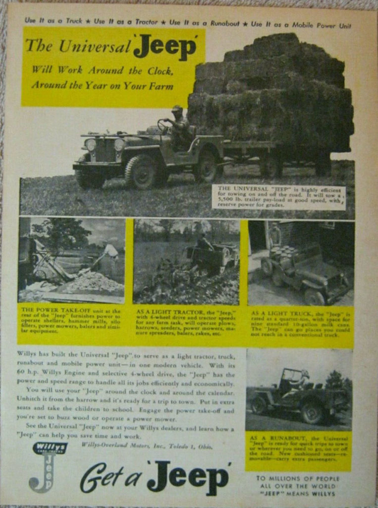 This ad, “JEEP” INVADES MIDWEST FARM, was published in the November 11, 1944, issue of the Saturday Evening Post, page 107.