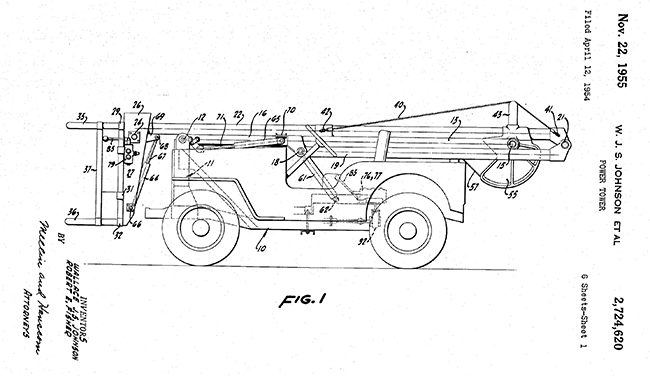 Here’s a description:  The present invention relates to a power tower for use by workmen employed as painters, electrical fixture repairrnen, aircraft maintenance men, window washers, and a multitude of similar occupations wherein it is necessary toperform a task at some distance above the ground and thus ordinarily require the use of ladders or scaffolding of some type. More particularly, the invention relates to a workmans platform supported by a collapsible tower structure which in turn is mounted on a wheeled vehicle.