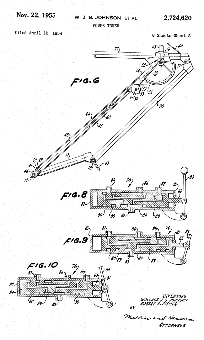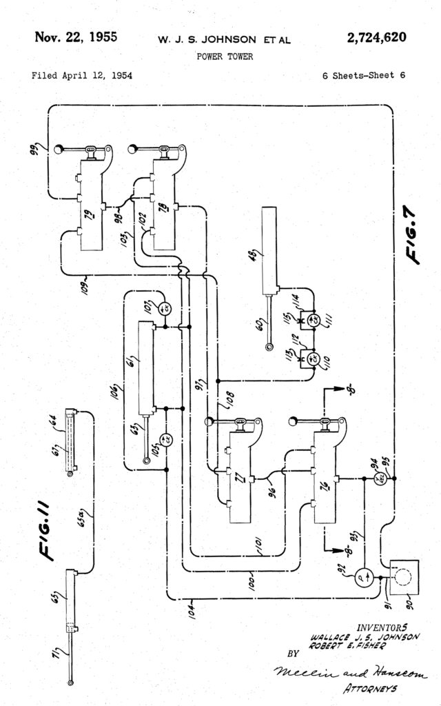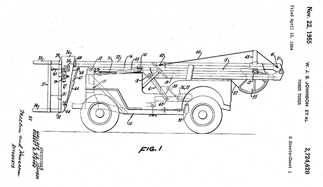 This April 12, 1954, Power Tower patent filing by Wallace Johnson and Robert Fisher was said to be designed for other vehicles besides the jeep, but given it’s length, it’s hard to imagine it would work on anything that wasn’t flat like the top of the jeep.