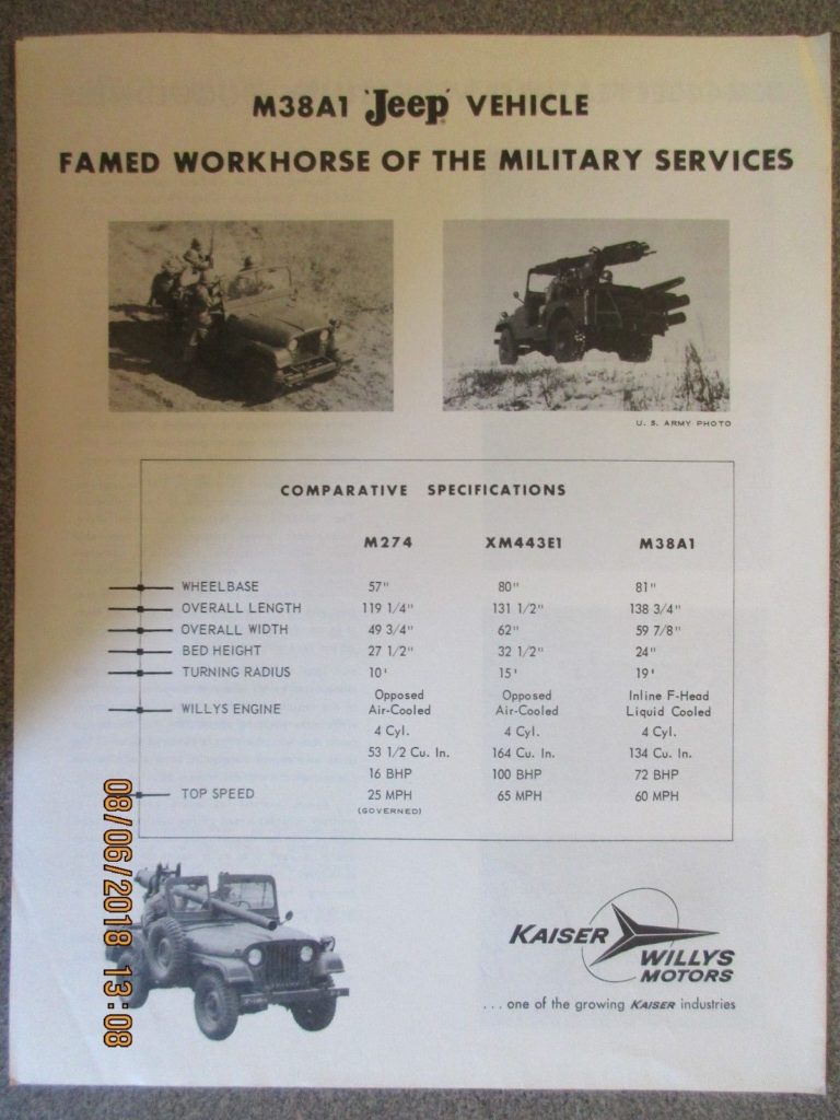(This unusual spec sheet compares the M-38A1 with the M-274 and the XM443E1. The M-38A1D image press photo is available currently on eBay.