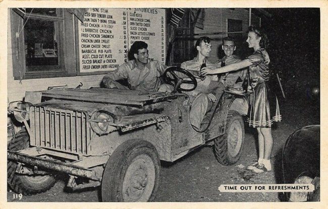 “U. S. Army Signal Corps. Jeep Soldiers Out For Refreshments.”