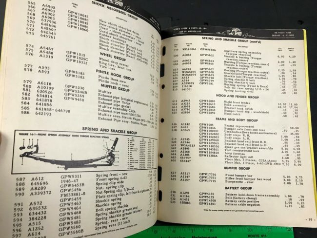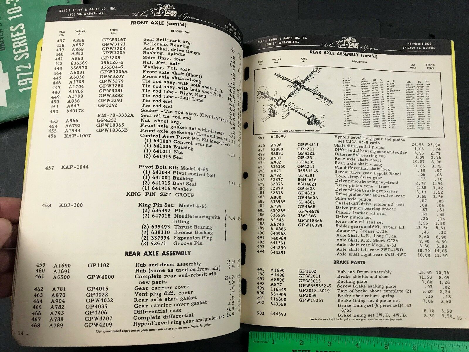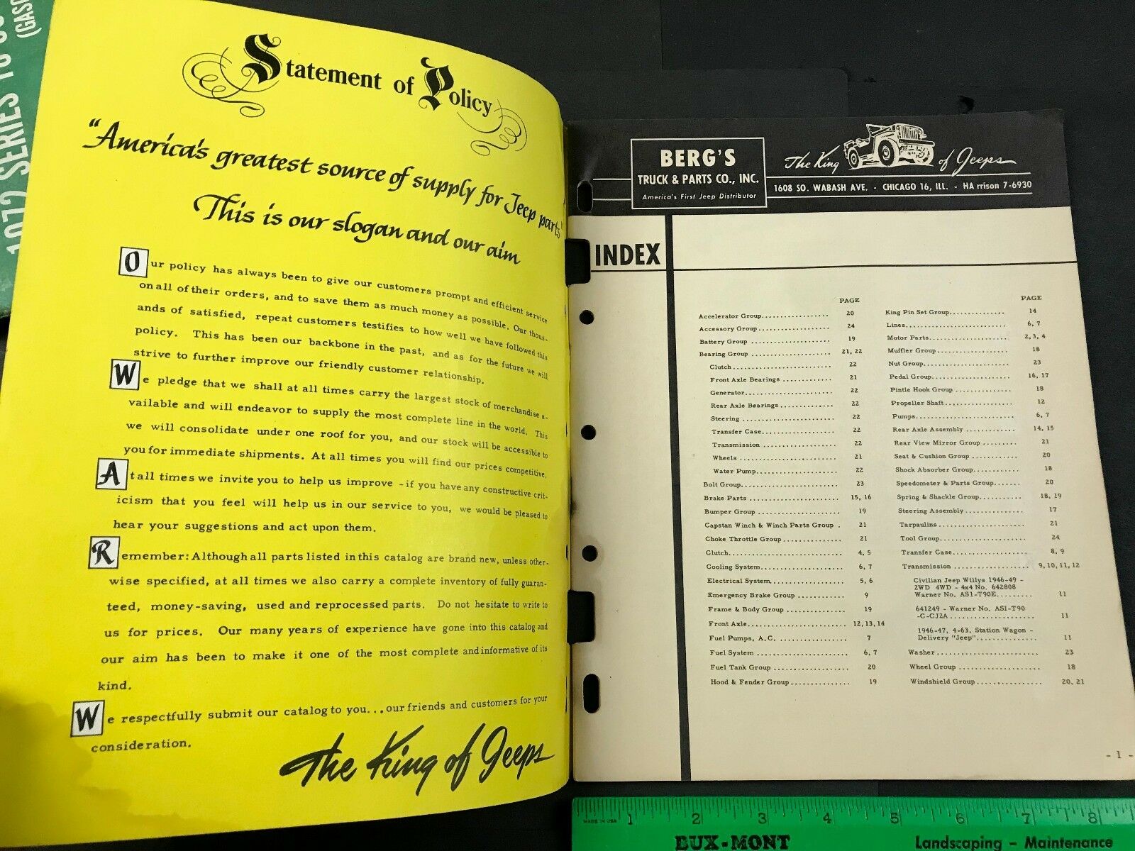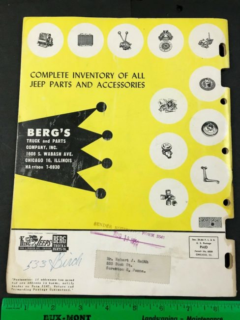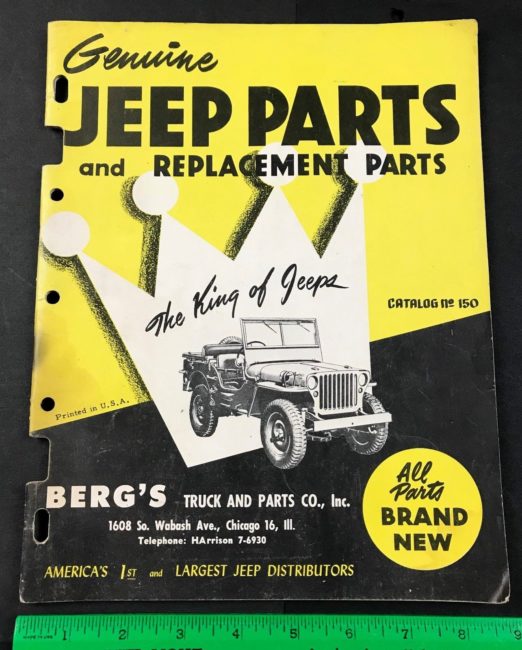“Offered – Berg’s Truck and Parts Co., Genuine Jeep Parts and Replacement Parts, Catalog 150. Age – Dated 1950, stamped on the back.”
