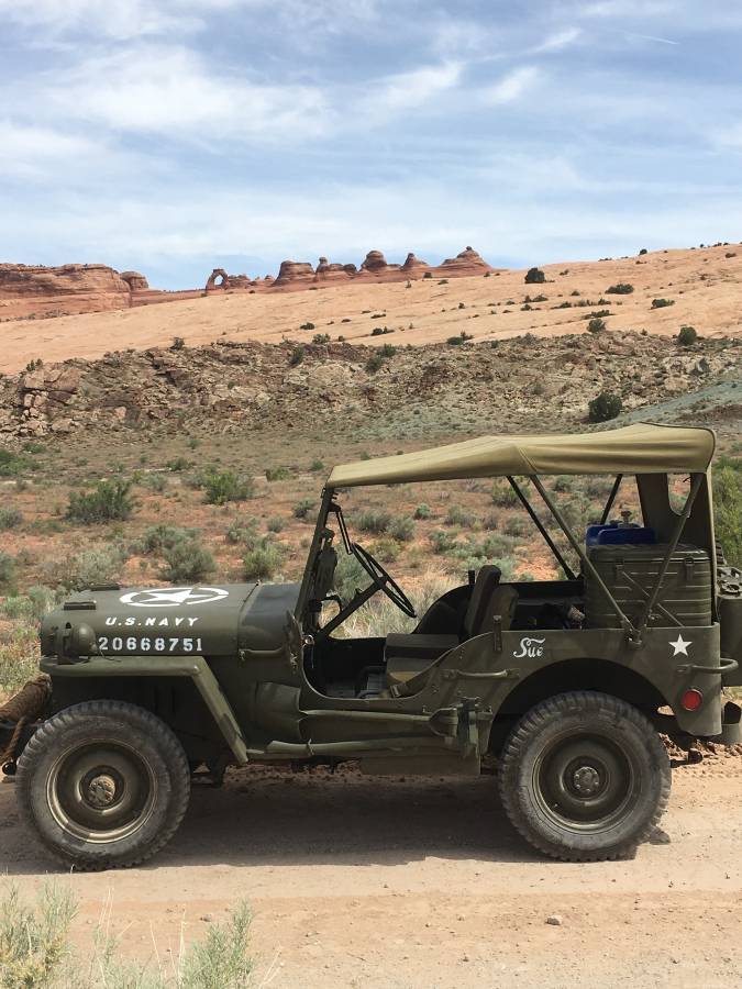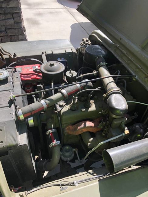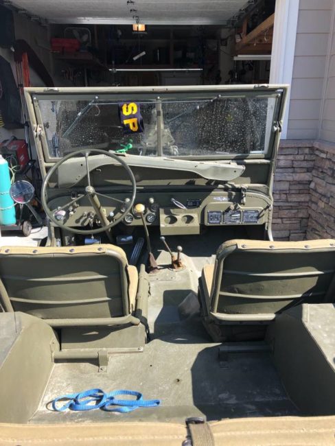 “Restored 3 yrs ago, all sheetmetal original other than repair panels and grill, have original grill as a wall hanger but is very usable, post war engine block with gpw internals professionally rebuilt, original T84 that is finicky and have to double clutch to shift down from 3rd to 2nd, all other running gear original and rebuilt, very nice old Jeep that gets tons of comments,”