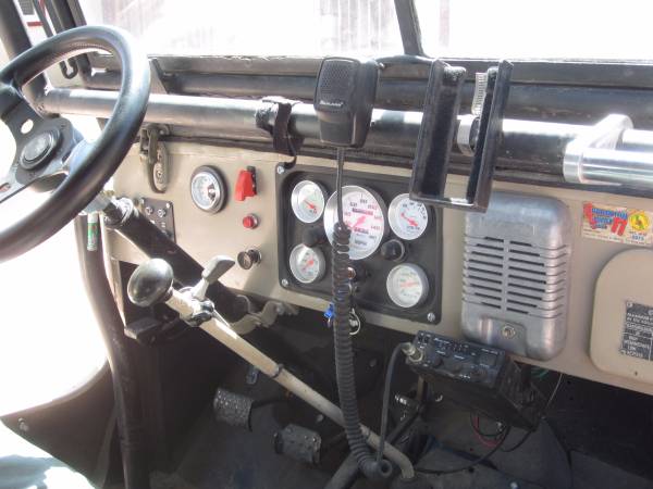 • Miscellaneous: Power steering, manual brakes (dual master cylinder), 12 gallon CJ5 steel gas tank with a heavy duty skid plate; swing out tire carrier, no top other than the snap on shade cloth, rear bumper has a receiver hitch; quick release removable steering wheel; thumb throttle which has helped me out of a jam many times; the lights work; the gauges work except for the cheapo tachometer isn’t wired, 2 gallon Rotopax gas can