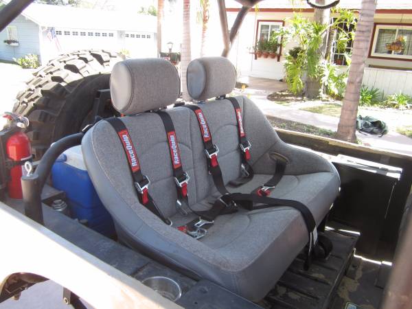 • Seats: Front are grey Mastercraft high backs with rain covers and 5 point harness; rear bench seat is a grey Racetrim, 42″ wide with removable headrests and two 5 point harnesses.