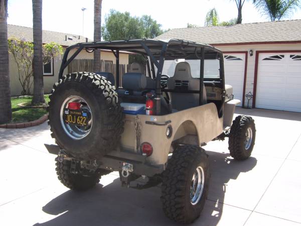 • Body, title, VIN, VIN plate, and original black California plates are from a 1960 Willys CJ3B. Clear title and current registration, both in my name. Tub is stretched behind the door openings; seats 4 adults. It sits on an early CJ6 frame. The wheel base is about 104″. Plenty of leg room & head room all around.