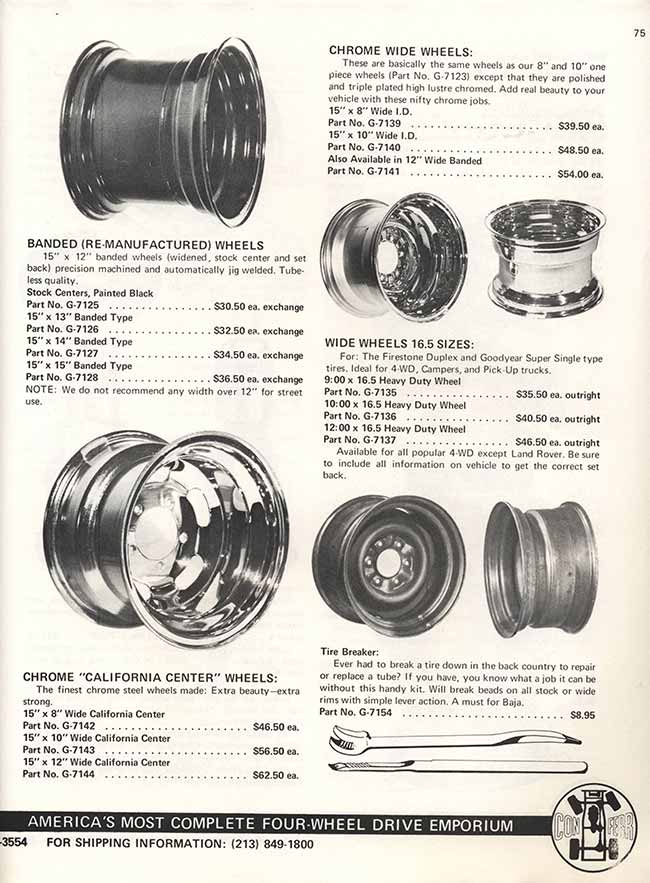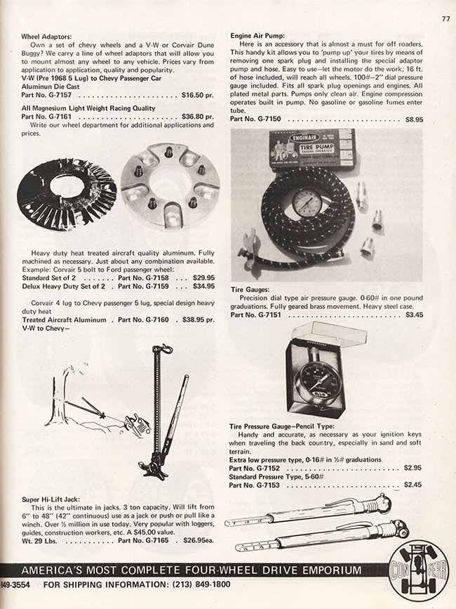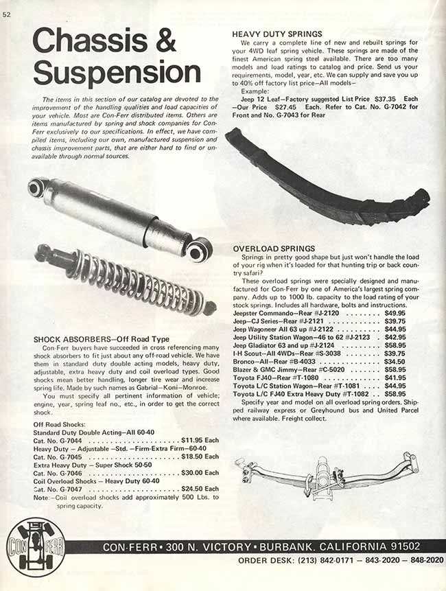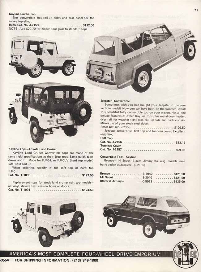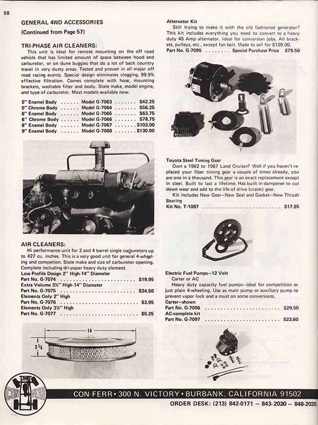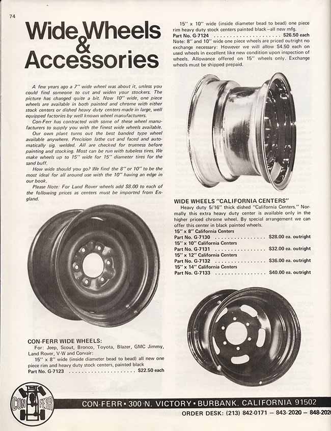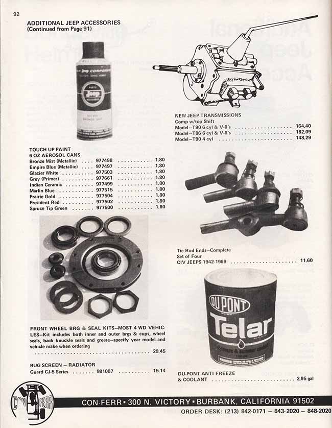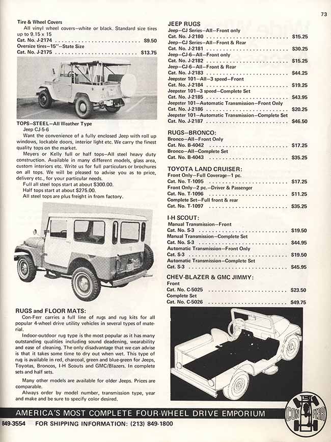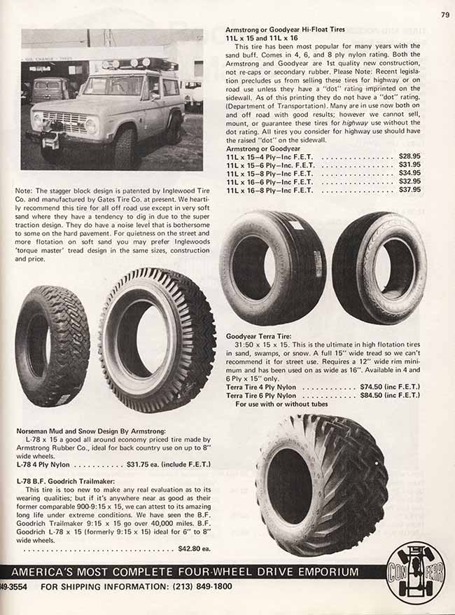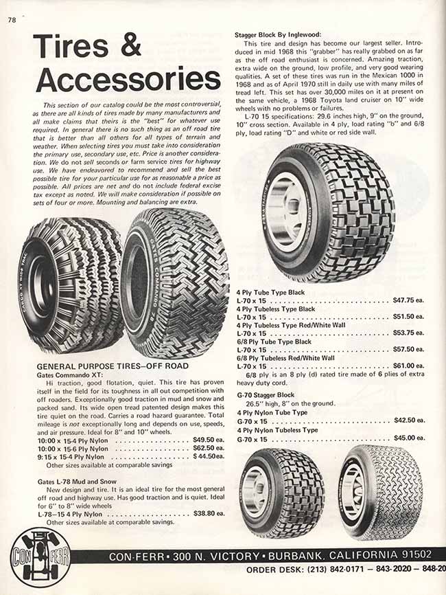 Hi Dave, thanks for posting the Confer catalog. It brings back some great memories during these difficult times. In 1970 I purchased a new Renegade 1 lime green Jeep and quickly removed the smooth tread G78-15 tires and installed new Gates XT Commando tires. I purchased them from a wonderful old Jeep dealership in Selingsgrove Pa. called MC Bonawitz & Son (now long gone). Those tires were the greatest for off road. Looking at the Confer catalog (which I always had close by) I saw that they sold for $49.00 and some change. Back then that was the bomb! I wore the pages out in that catalog. Thanks again for all you do with Ewillys. Regards, Bill Garland. Carlisle Pa.