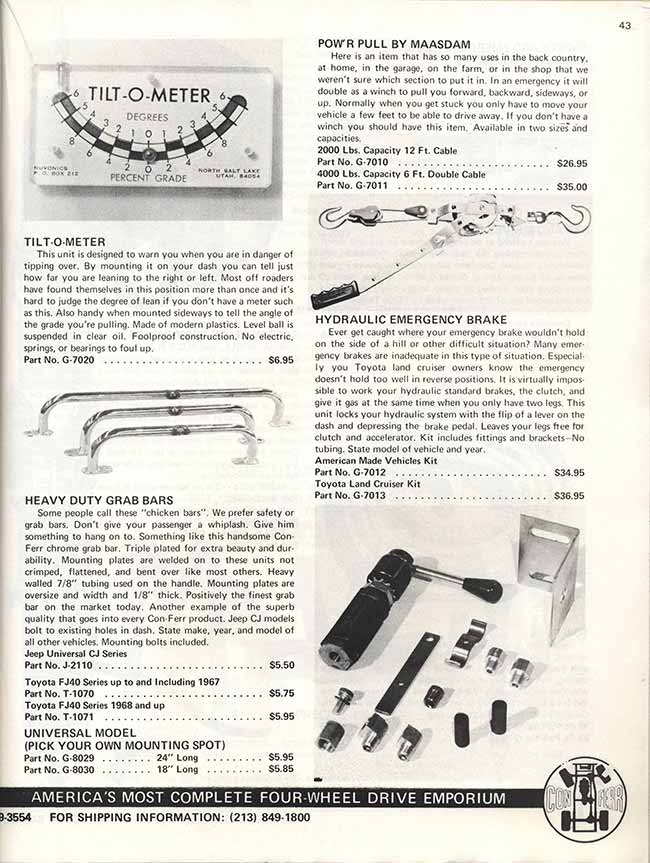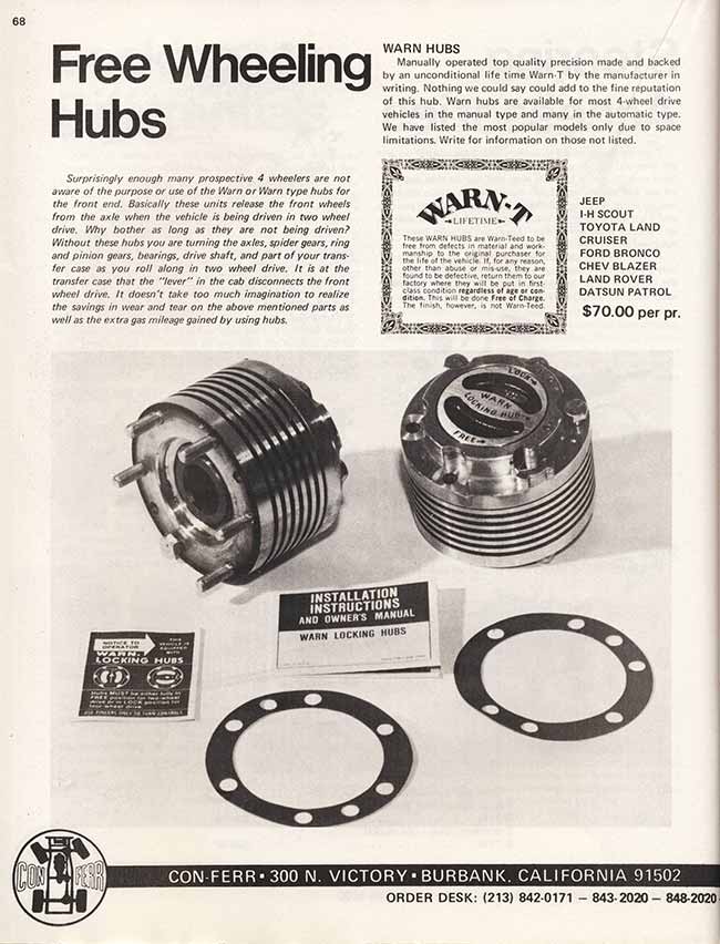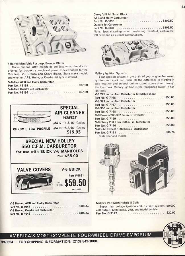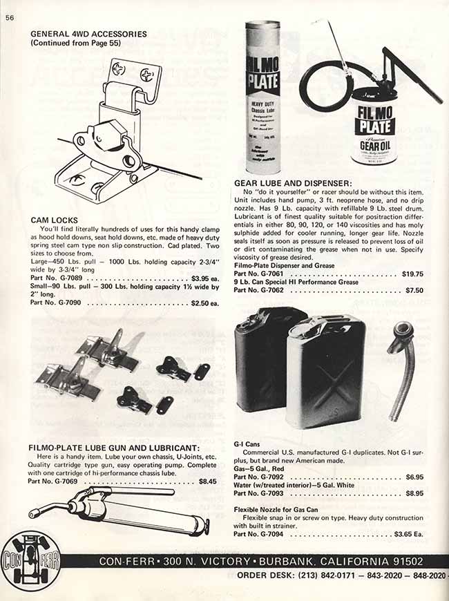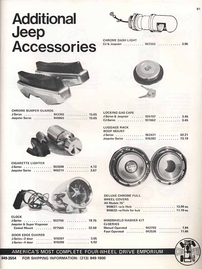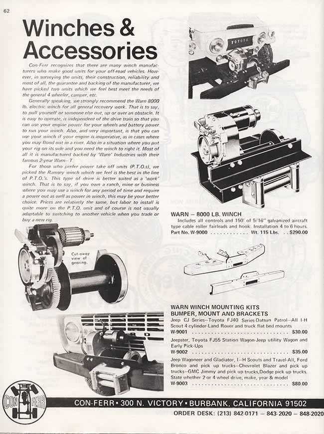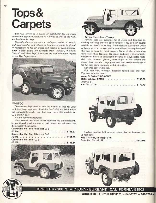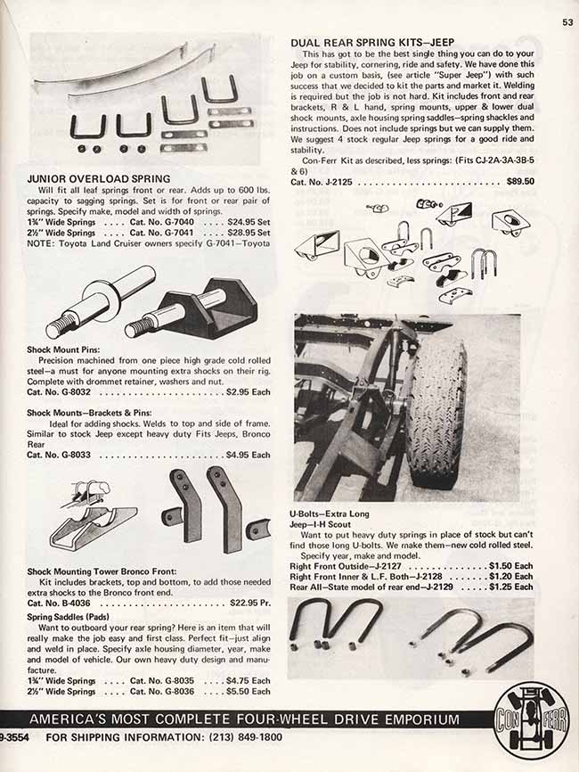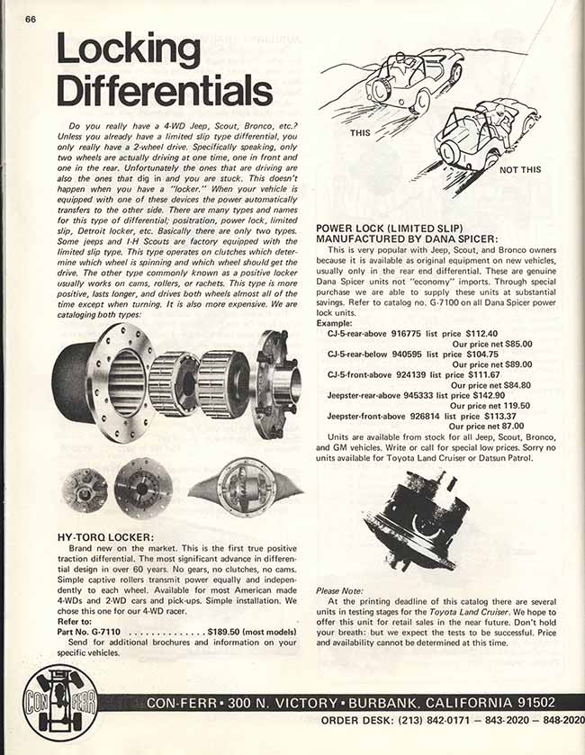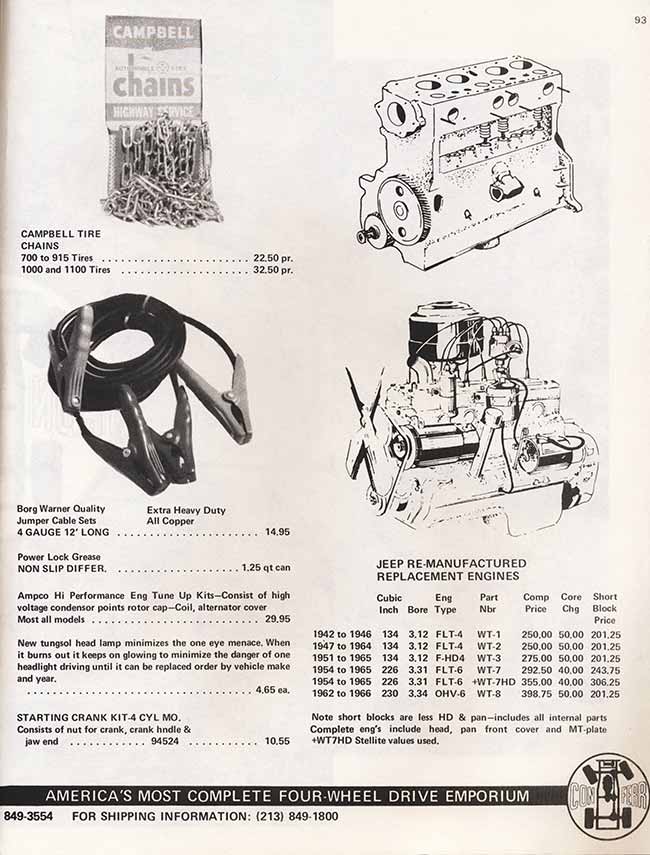 Hi Dave, thanks for posting the Confer catalog. It brings back some great memories during these difficult times. In 1970 I purchased a new Renegade 1 lime green Jeep and quickly removed the smooth tread G78-15 tires and installed new Gates XT Commando tires. I purchased them from a wonderful old Jeep dealership in Selingsgrove Pa. called MC Bonawitz & Son (now long gone). Those tires were the greatest for off road. Looking at the Confer catalog (which I always had close by) I saw that they sold for $49.00 and some change. Back then that was the bomb! I wore the pages out in that catalog. Thanks again for all you do with Ewillys. Regards, Bill Garland. Carlisle Pa.