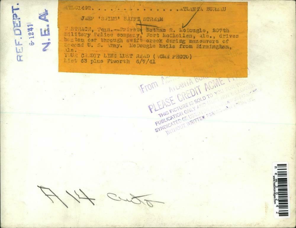 “1941 Press Photo Wartrace, Tenn. US Army jeep & Pvt NR McDougle of MPs. Photo measures 9 x 7 inches. Photo is dated 6-7-1941.”