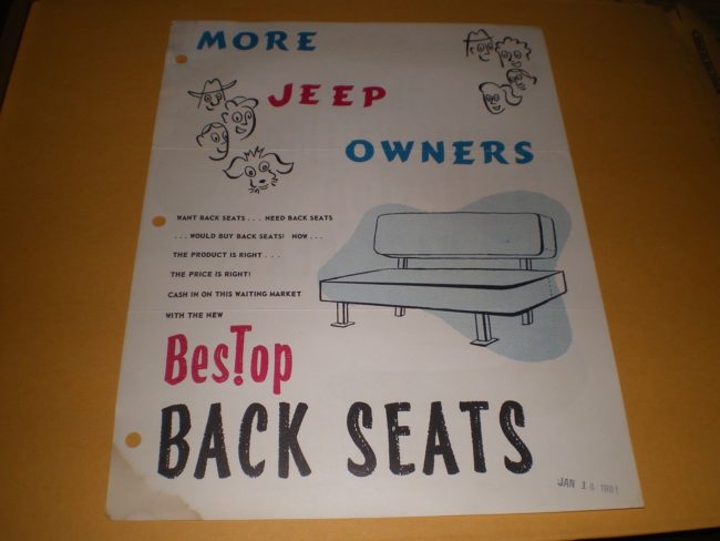 The only evidence I could find that Bestop expanded it’s produced line under Tom was this 1961 brochure introducing rear seats. The seats have a flat, simple design.