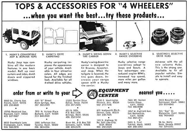 October 1967 Ad for Selectro and Husky products under the 4Wheel Equipment Center. The ad indicates that the number of top type Husky was selling had been dropped to one basic model.