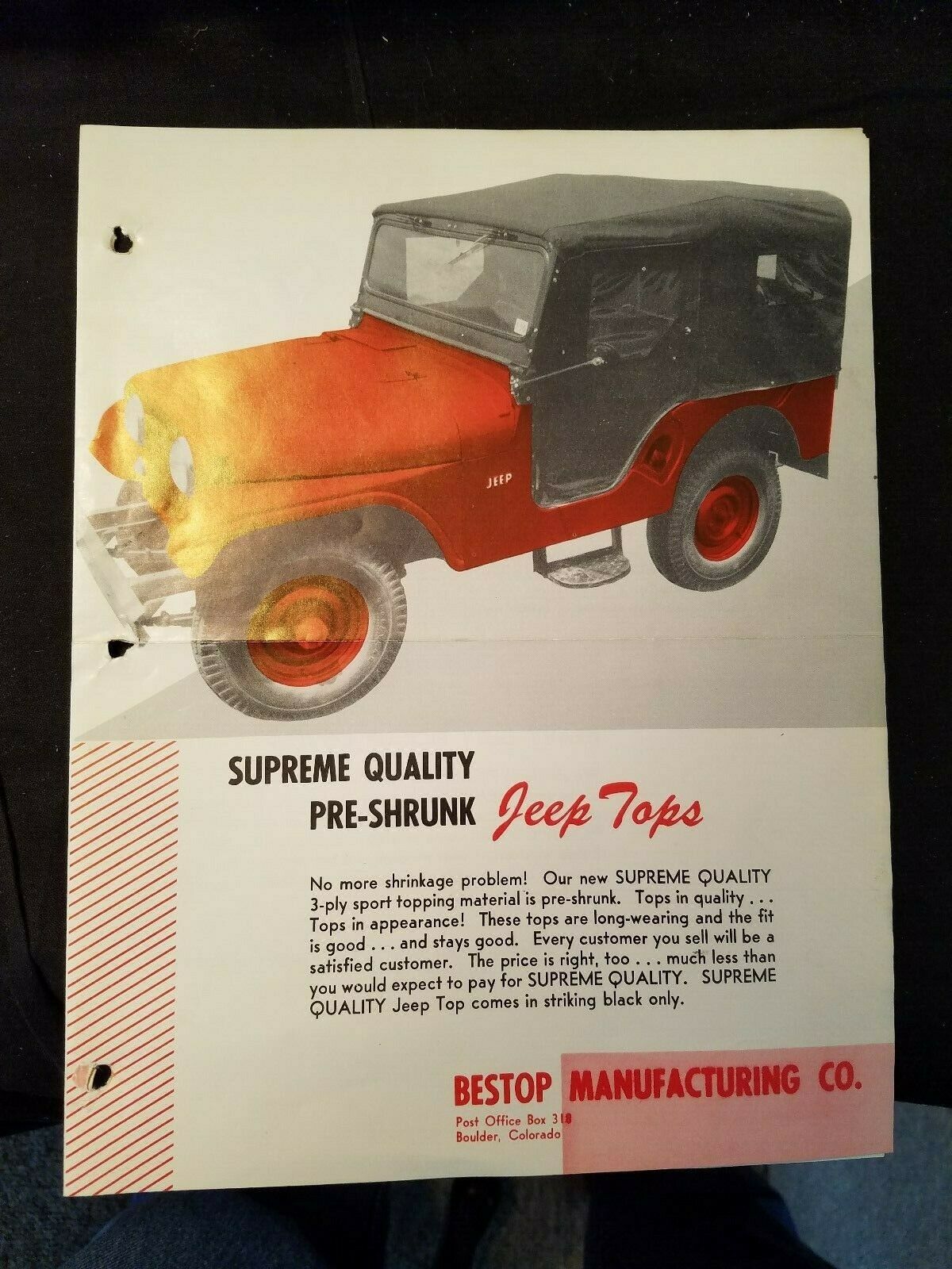In the early 1950s, Tom Bradley ran an auto upholstery shop in Boulder, Colorado. After some customers came to him wanting repairs to their soft jeep tops, Tom decided he could build a better top, so he launched Bestop on a part-time basis in 1954. According to the Bestop website, “Working out of an old brick schoolhouse with seven employees, Bestop quickly developed a reputation for quality and the word spread.” And, from 4wd.com, “To [Tom’s] surprise, the Jeep replacement tops began making more profit than the upholstery projects. It wasn’t long before Bradley decided to sell his upholstery business and focus on designing and manufacturing tops.”