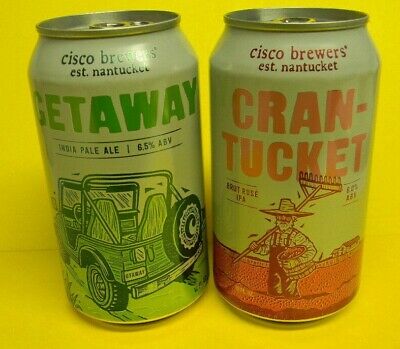 “HERE ARE 2 BRAND NEW, CRAFT BREWERY BEER CANS FROM THE CRAFT BREWERY IN NANTUCKET MASSACHUSETTS. GETAWAY IPA WITH A COOL JEEP CJ-5 ON THE BEACH LOGO AND CRAN-TUCKET WITH A CRANBERRY FARMER. COOL PAINTED LABEL CANS. BOTH IN EXCELLENT CONDITION.”