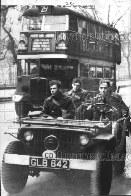 There’s something curious about this picture. Why does this supposedly military jeep have a British civilian license plate? Just compare it to the license plate on the bus and the car behind.